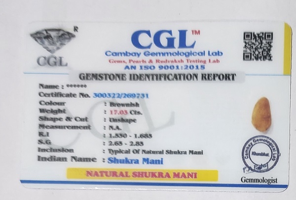 1- शुक्र मणि लैब द्वारा प्रमाणित रहेगी.